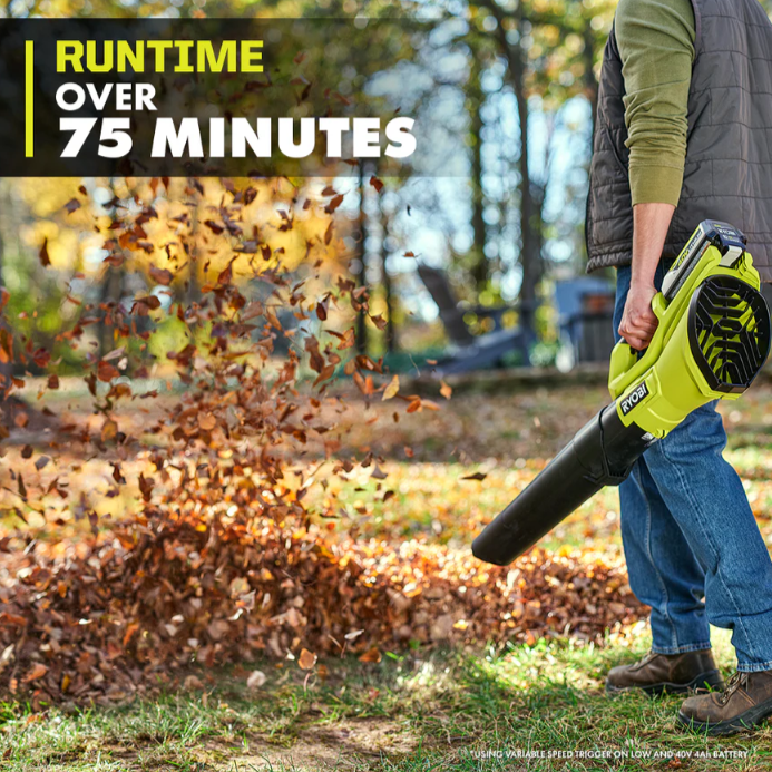 Power through yard cleanup with the RYOBI 40V 550 CFM Blower Kit. Designed as a true gas replacement, it delivers the power of a 25cc gas blower without the fuel, noise, or maintenance. With 550 CFM and speeds up to 120 MPH, this lightweight, cordless blower makes clearing leaves and debris fast and effortless. The variable speed trigger gives you precise control for delicate areas or tough debris, while the long-lasting 40V 4Ah battery provides over 75 minutes of runtime. Built for comfort, convenience, and performance, this blower is perfect for any yard task.