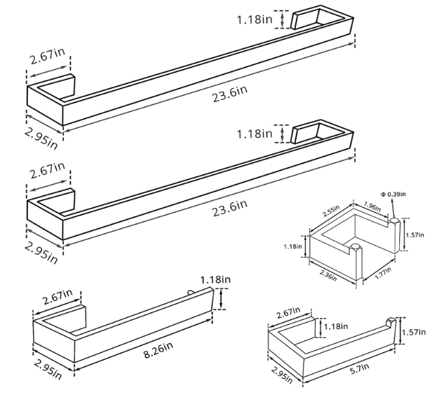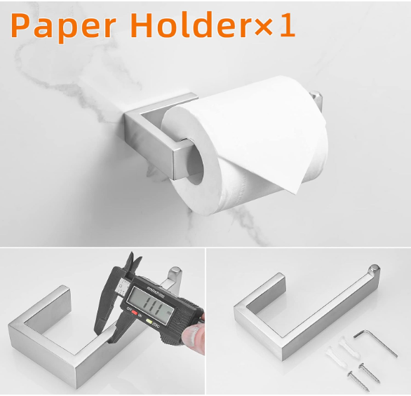 ✔ Complete 5-piece set: Includes 2 × 23.6" towel bars, 1 × 5.7" toilet paper holder, 1 × 8.26" towel ring, and 1 × 2.55" double robe hook