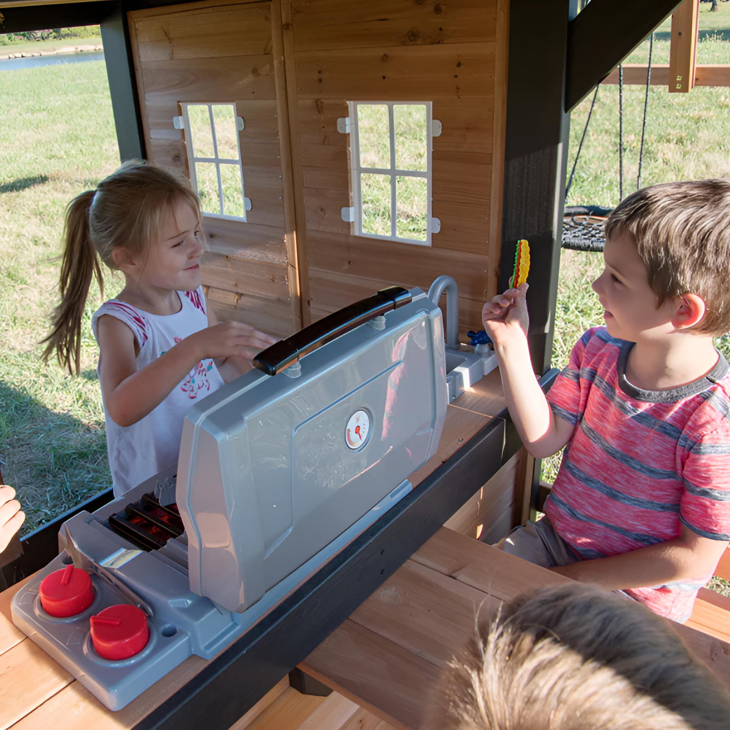 ✓ Lower Playhouse Area – Includes a toy BBQ grill, sink, and play food to encourage creativity and role-playing