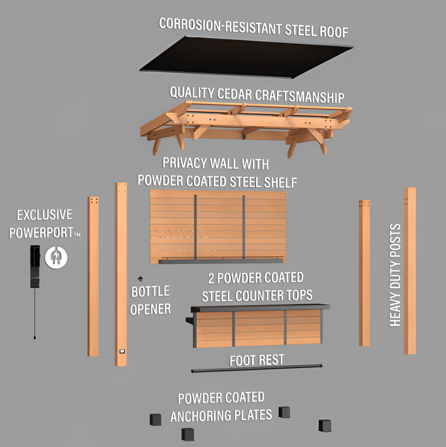 ✓ Cedar Privacy Wall – Adds seclusion and is ideal for mounting an outdoor TV (TV and mount not included)