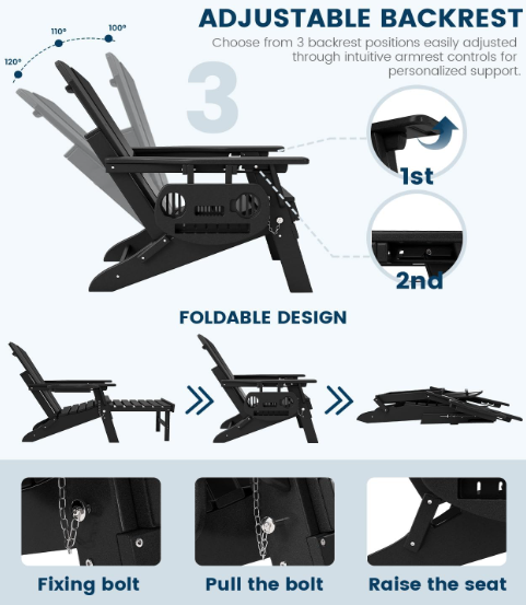 Relax in style and comfort with this Folding Adjustable Adirondack Chair Set, designed for outdoor patios, lawns, and fire pits. With a retractable ottoman, versatile cup holder trays, and weather-resistant HDPE construction, this set combines durability, convenience, and luxury for you and your guests.