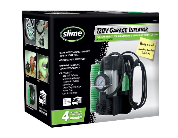 The Slime 120V Garage Tire Inflator is your all-in-one solution for inflating tires quickly and safely. Designed for garage use, it plugs into any wall outlet, mounts easily with the included bracket, and comes with a full accessory kit to handle all your tire and inflating needs.