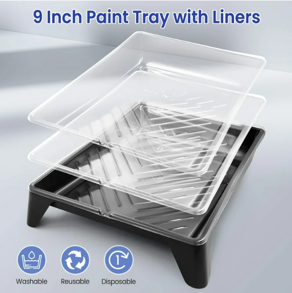 ✔ Durable & Easy-to-Clean Tray: Heavy-duty, crack-resistant plastic tray with a textured surface ensures even roller coating and minimal drips; disposable liners make cleanup effortless.