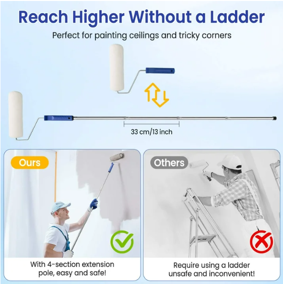 ✔ Extension Poles for Hard-to-Reach Areas: 4 adjustable poles (13" each, extendable to 50") let you paint ceilings and high corners safely without a ladder.