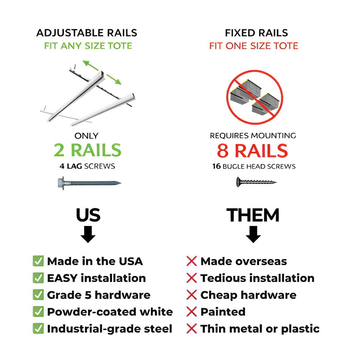 Tote Slide Adjustable Rails – Organize 3 to 5 Storage Totes, Ceiling or Wall Mounted System